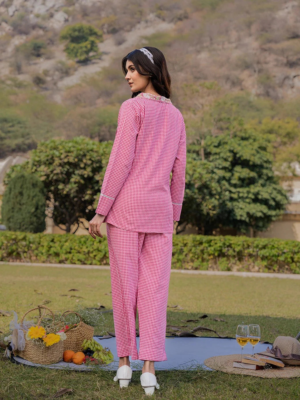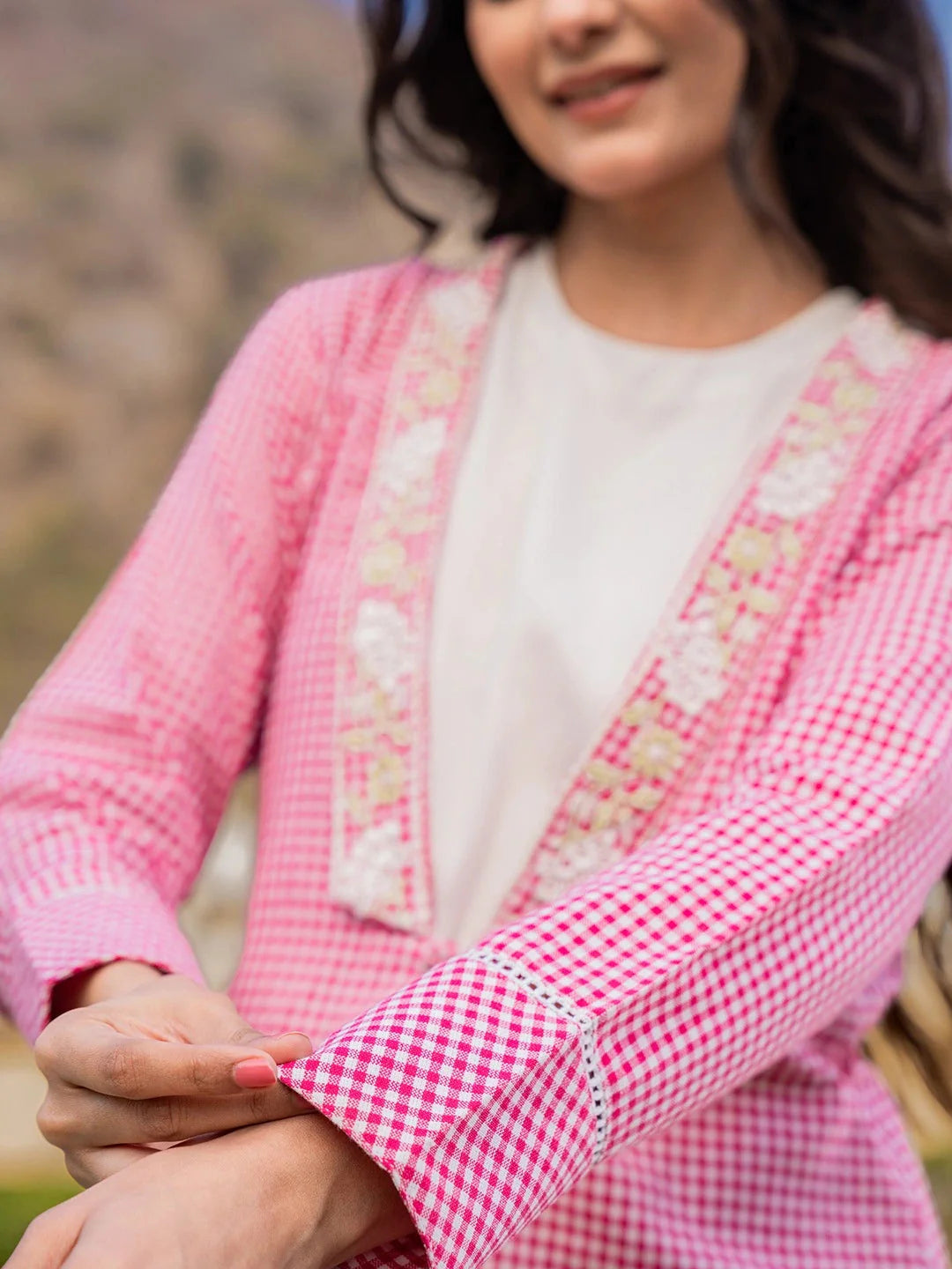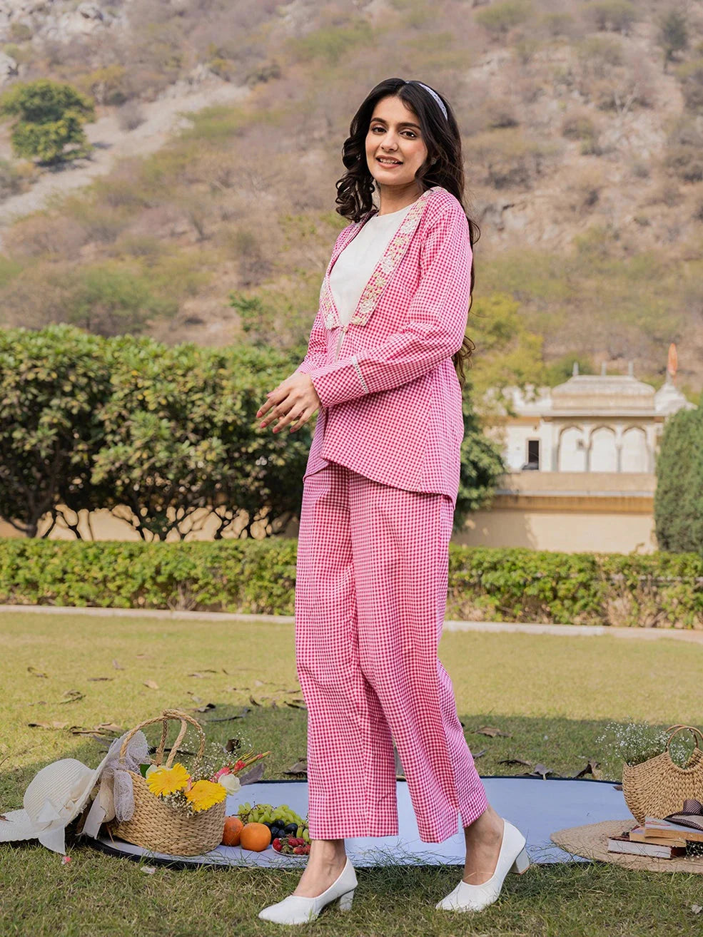 Yufta Pink Cotton Checks Print Shawl Neck Co Ord Set With Embroidery PRODUCT DETAILS: This co-ords consists of top and trouserswhite solid top, ha...