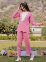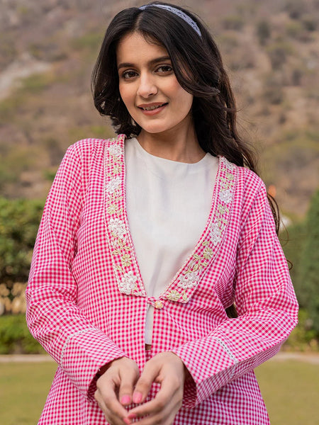 Yufta Pink Cotton Checks Print Shawl Neck Co Ord Set With Embroidery
