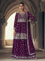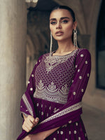 Drape yourself in timeless elegance and be the epitome of grace with our Purple Real Georgette Gharara Style Embroidered Suit, a symbol of Indian tradition and craftsmanship at its finest."