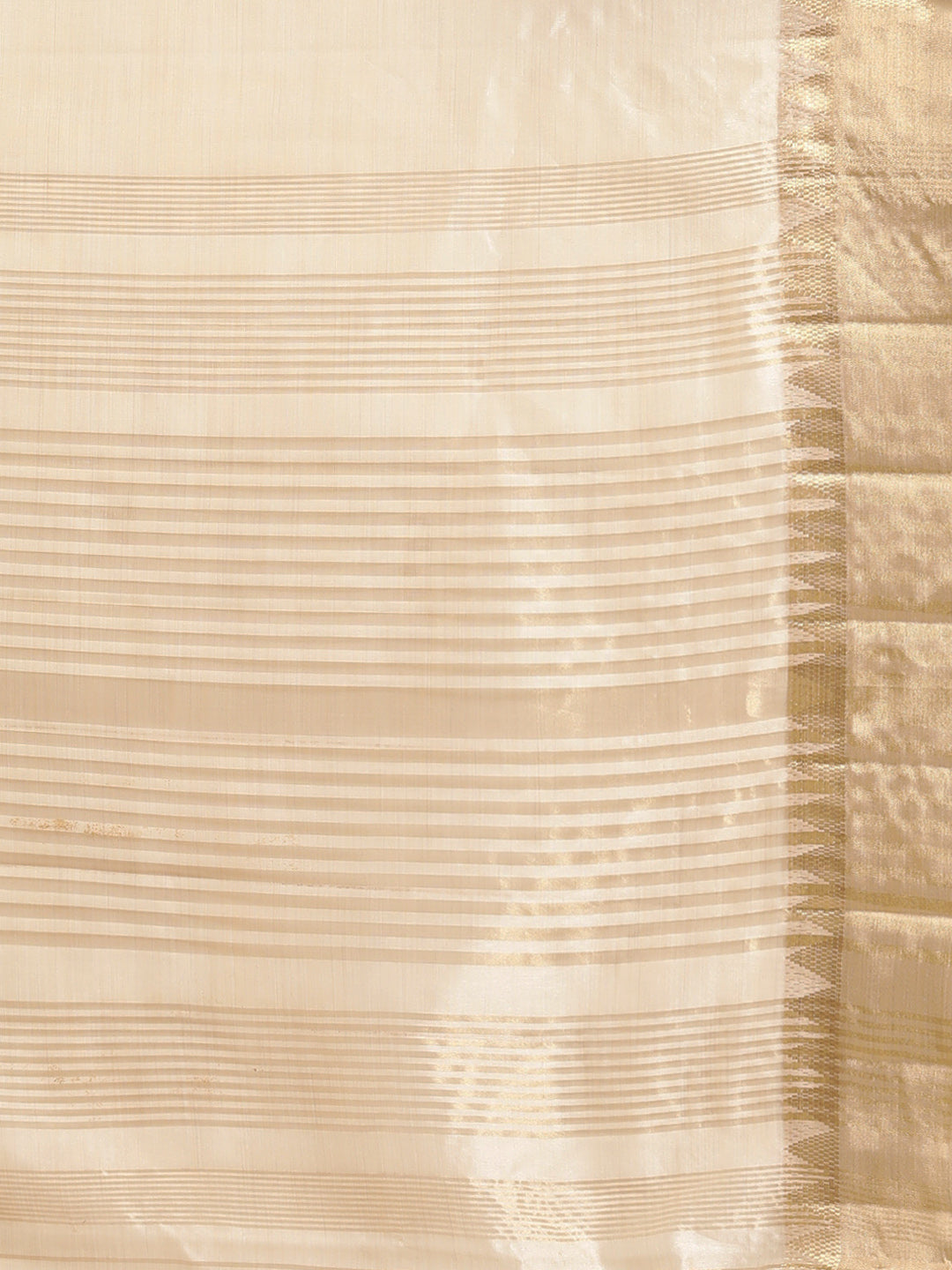 Cream-Coloured and Golden striped zari saree and has a woven design border