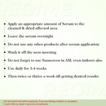 • Apply an appropriate amount of serum without spreading harshly on the cleaned & dry affected area in a thin layer before bedtime. Wash it off the following day. Do not use any other products after application & don’t forget to use sunscreen. Use daily for 3-4 weeks, then twice a week till getting desired results.