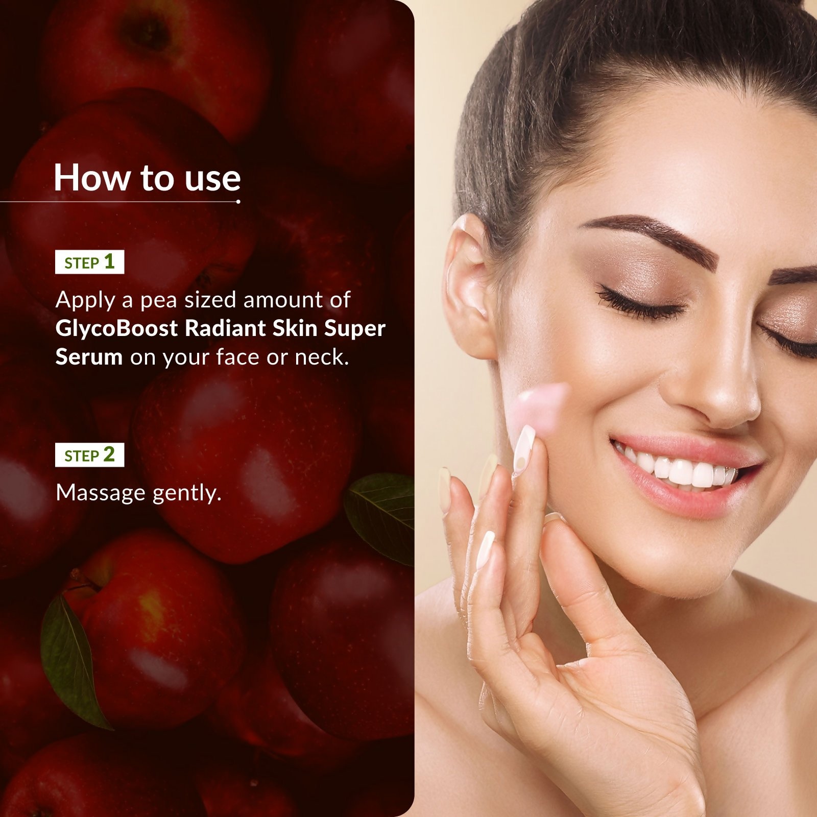 After cleansing the face with Glycoboost Radiant Skin Face Wash, apply a pea-sized amount of this serum smoothly onto face and neck till absorption to get a luminous skin. Follow with GlycoBoost Radiant Skin Serum Creme.