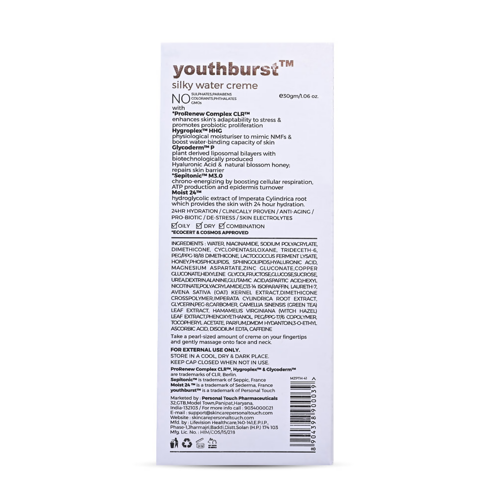 Personal Touch Youthburst Water Gel MoisturiserAbout The Product:Youthburst Water-based Face Cream by Personal Touch Skincare is a lightweight, non...
