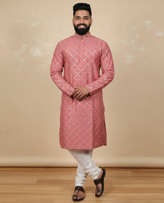 Neera Trendz Pink Heavy Soft Silk Mirror Work Men's Kurta Pyjama
