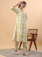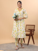 Janasya A-Line Cambric White Floral V-Neck Set - M