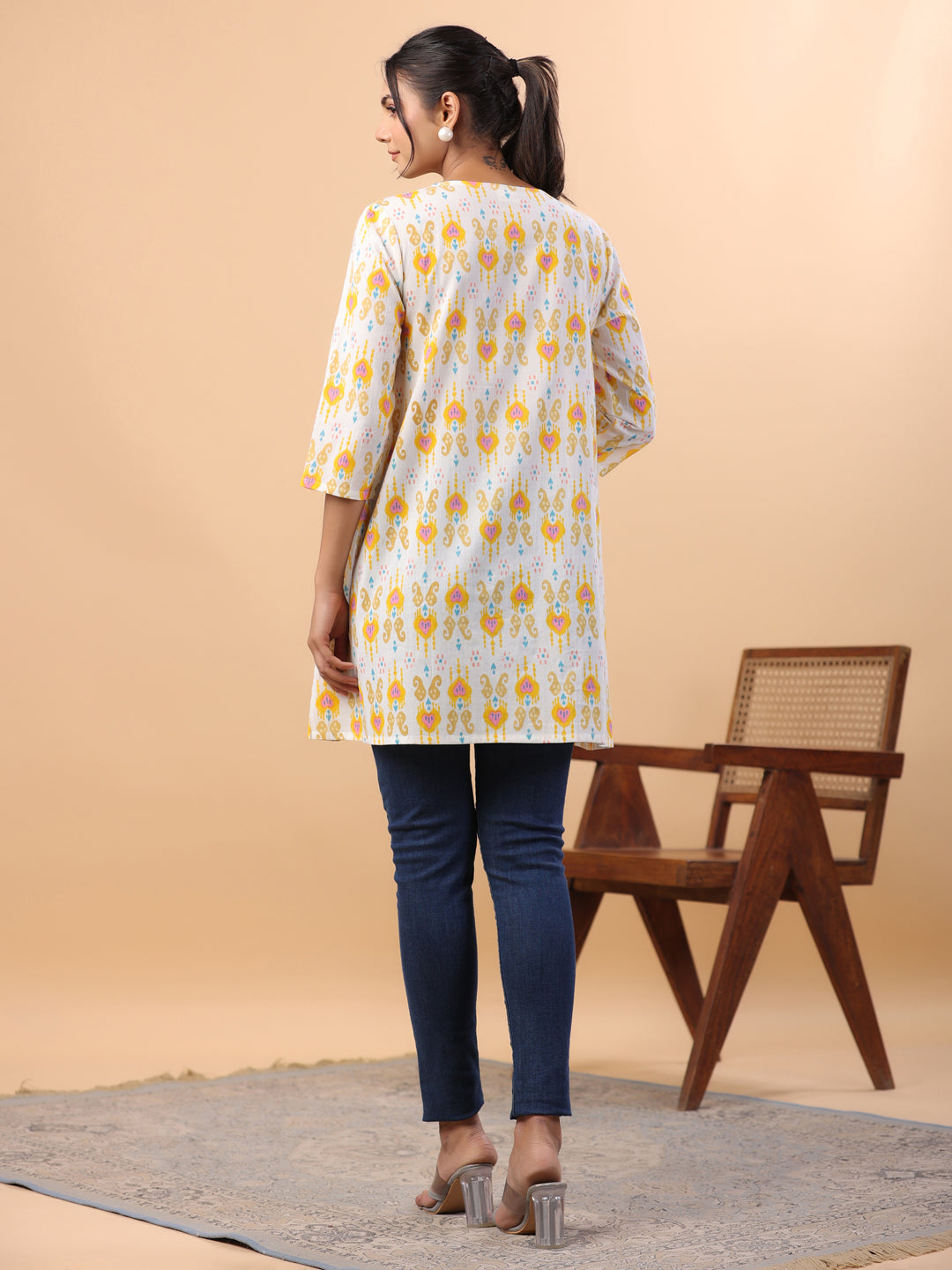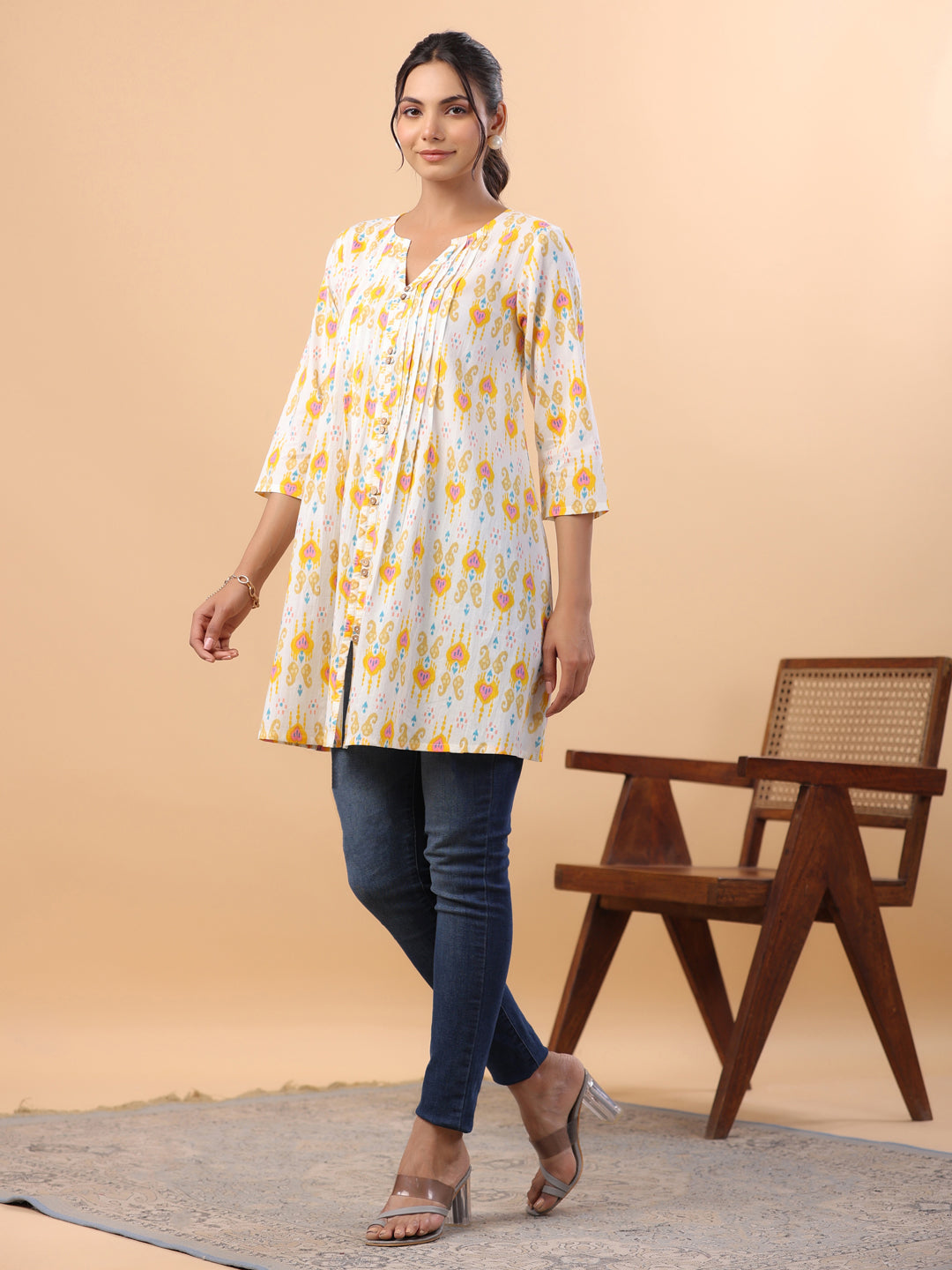 Janasya Pleated Cambric White Ikkat Notch Neck Tunic - Distacart