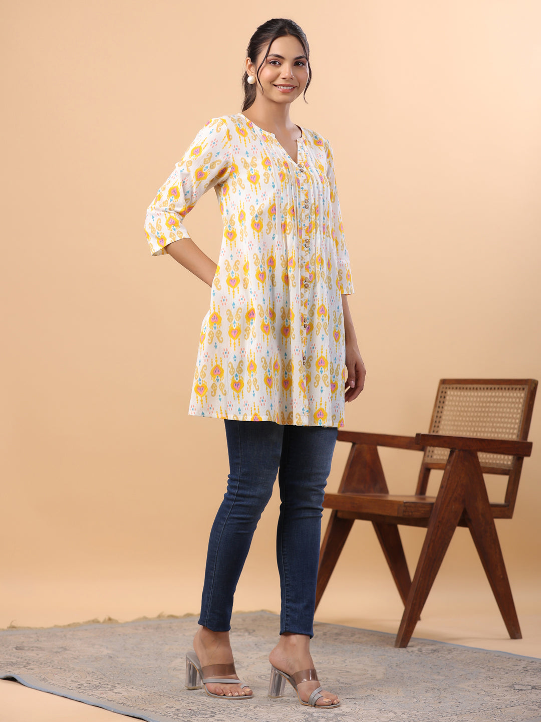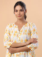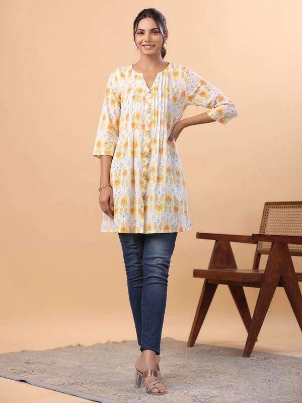 Janasya Pleated Cambric White Ikkat Notch Neck Tunic
