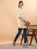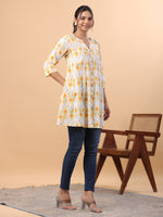 Janasya Pleated Cambric White Ikkat Notch Neck Tunic - XS
