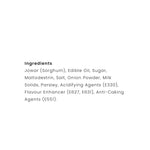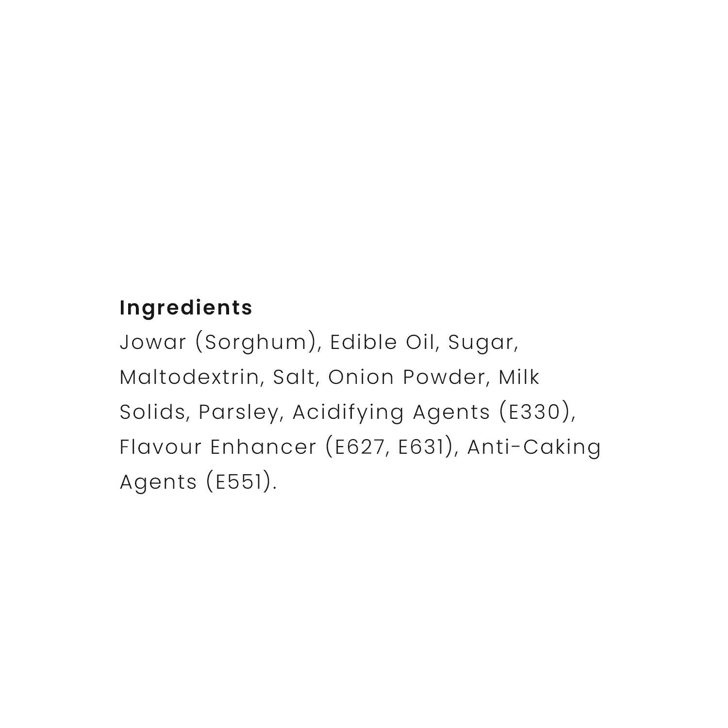 Jowar (Sorghum), Edible Oil, Sugar, Maltodextrin, Salt, Onion Powder, Milk Solids, Parsley, Acidifying Agent (E 330), Flavour Enhancer (E 627, E 631), Anti - Caking Agents (E 551)