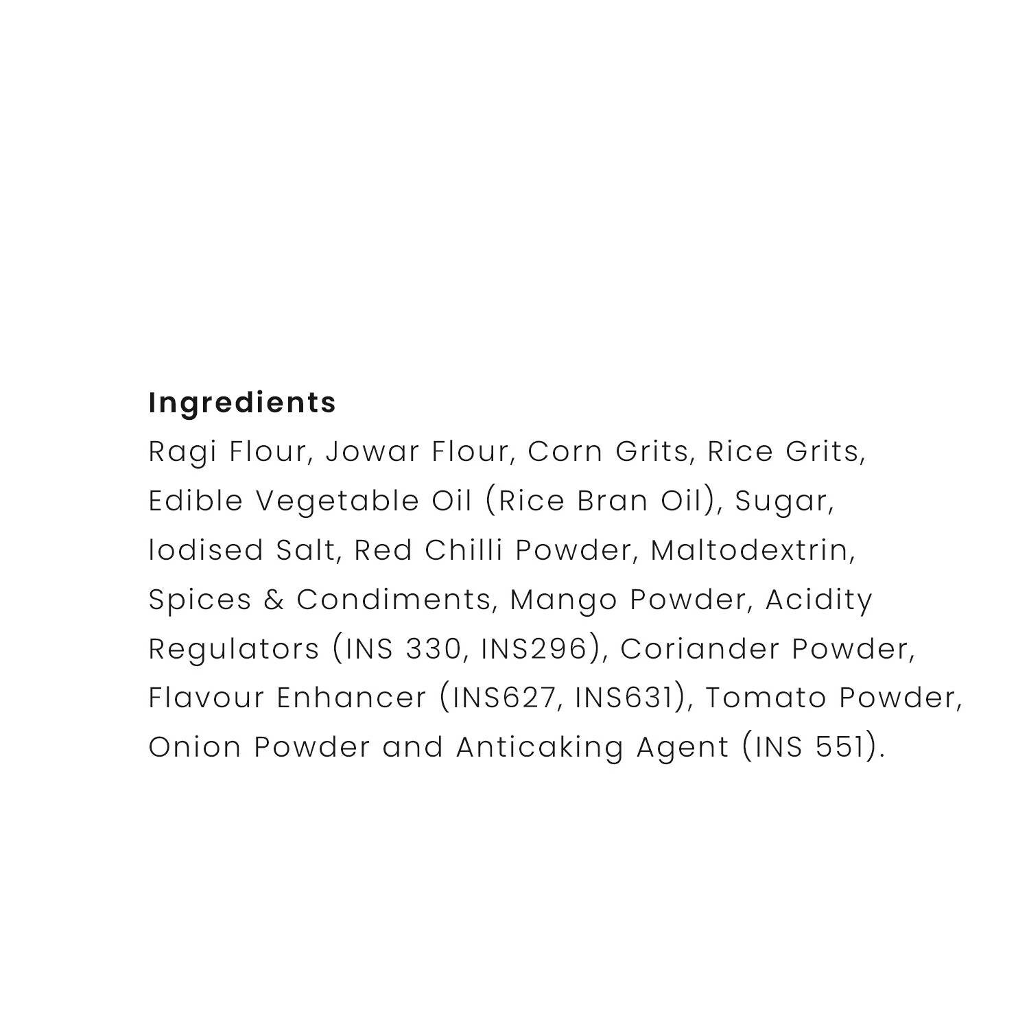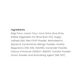 Ragi Flour, Jowar Flour, Corn Grits, Rice Grits, Edible vegetable Oil (Rice Bran Oil), Sugar, Salt, Red Chilli Powder, Maltodextrin, Spices & Condiments, Mango Powder, Acidity Regulators (INS 330, INS 296), Coriander Powder, Flavour Enhancer (INS 627, INS 631), Tomato Powder, Onion Powder and Anticaking Agent (INS 551)