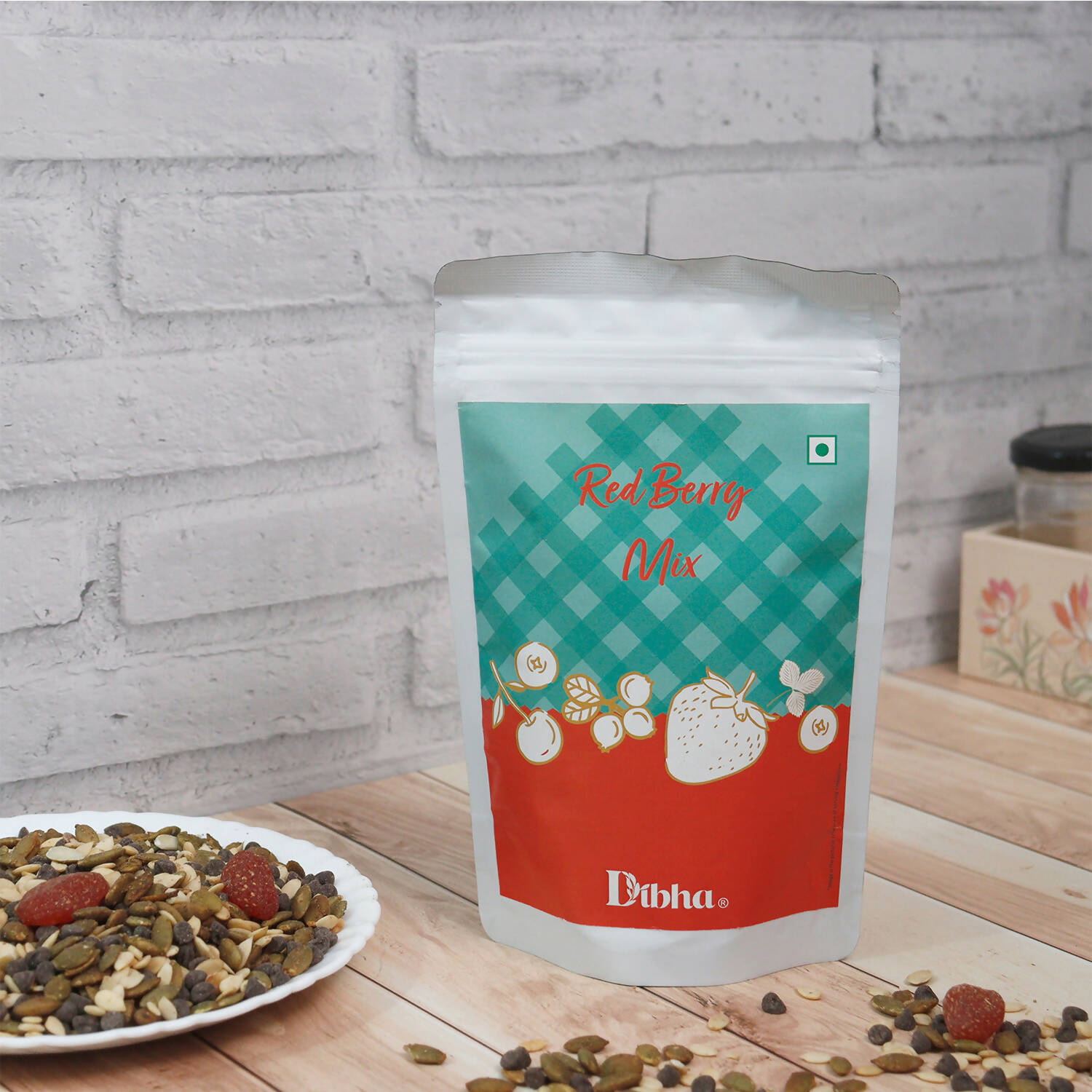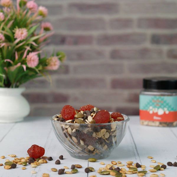 DIBHA - HONEST SNACKING Red Berry Blast trail mix brings you the perfect selection of mixed nuts, seeds, dark choco chips, and dehydrated fresh fruits. Snacking becomes healthy and easy with this trail mix. It can make you feel energized at any time of the day. The ingredients used are masala strawberry, choco chips, pumpkin seeds, watermelon seeds, and sunflower seeds. It helps in weight management, strengthens muscles, builds immunity, is easy to digest, and is keto-friendly.
