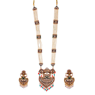 Gold-Polished Alloy Long Pearl Rani Haar Necklace With Designer Thewa Pendant Set - The Pari