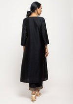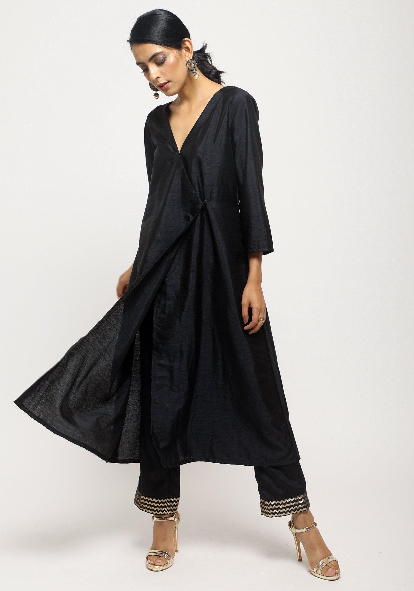 • Silk blend high slit foil kurta with foil border silk blend pants.
