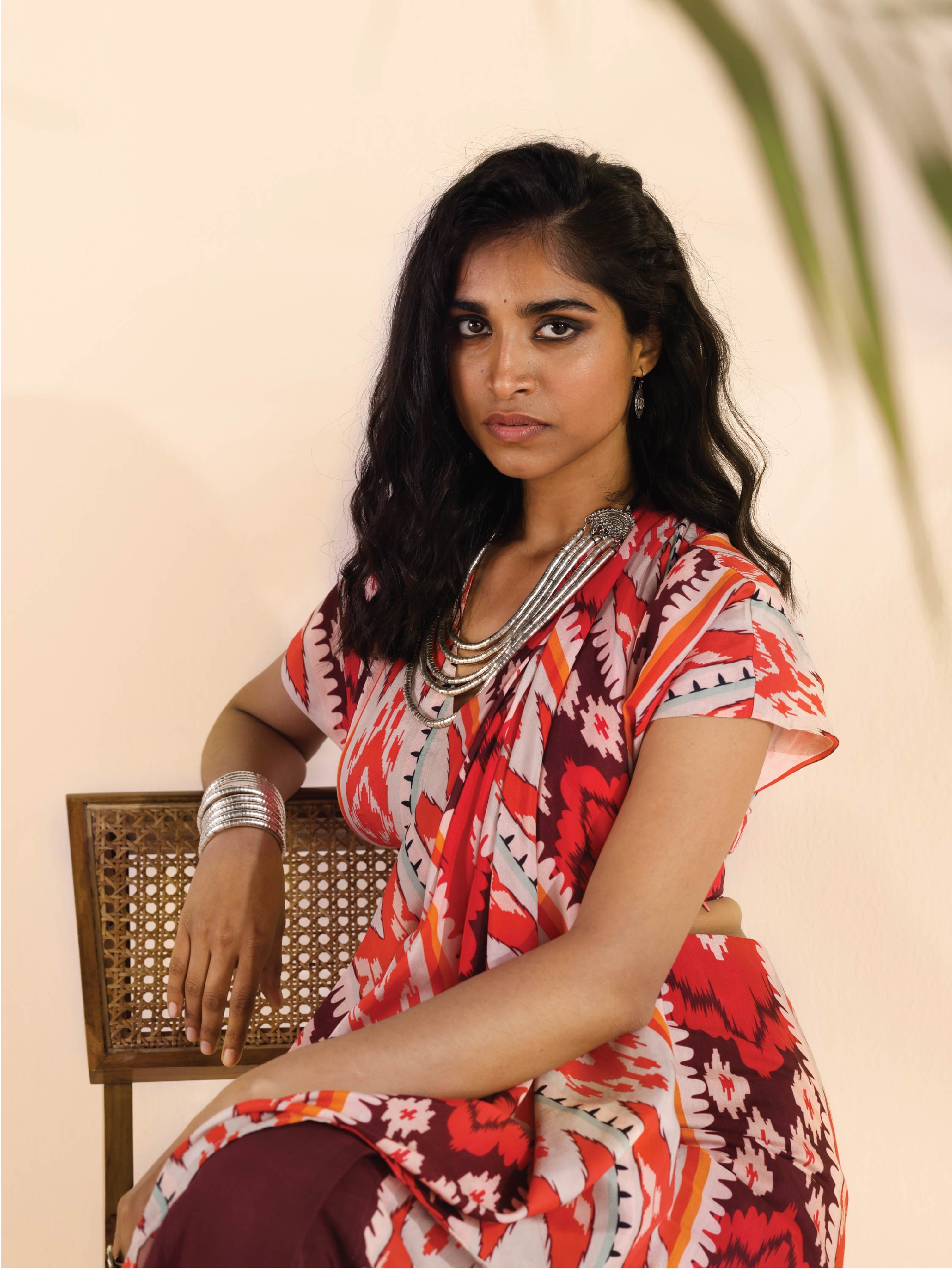 • Muslin Ikat Stripe Printed pre-stitched saree with solid Muslin Silk. Style with a Blouse/Top and a pair of mules to complete the look.