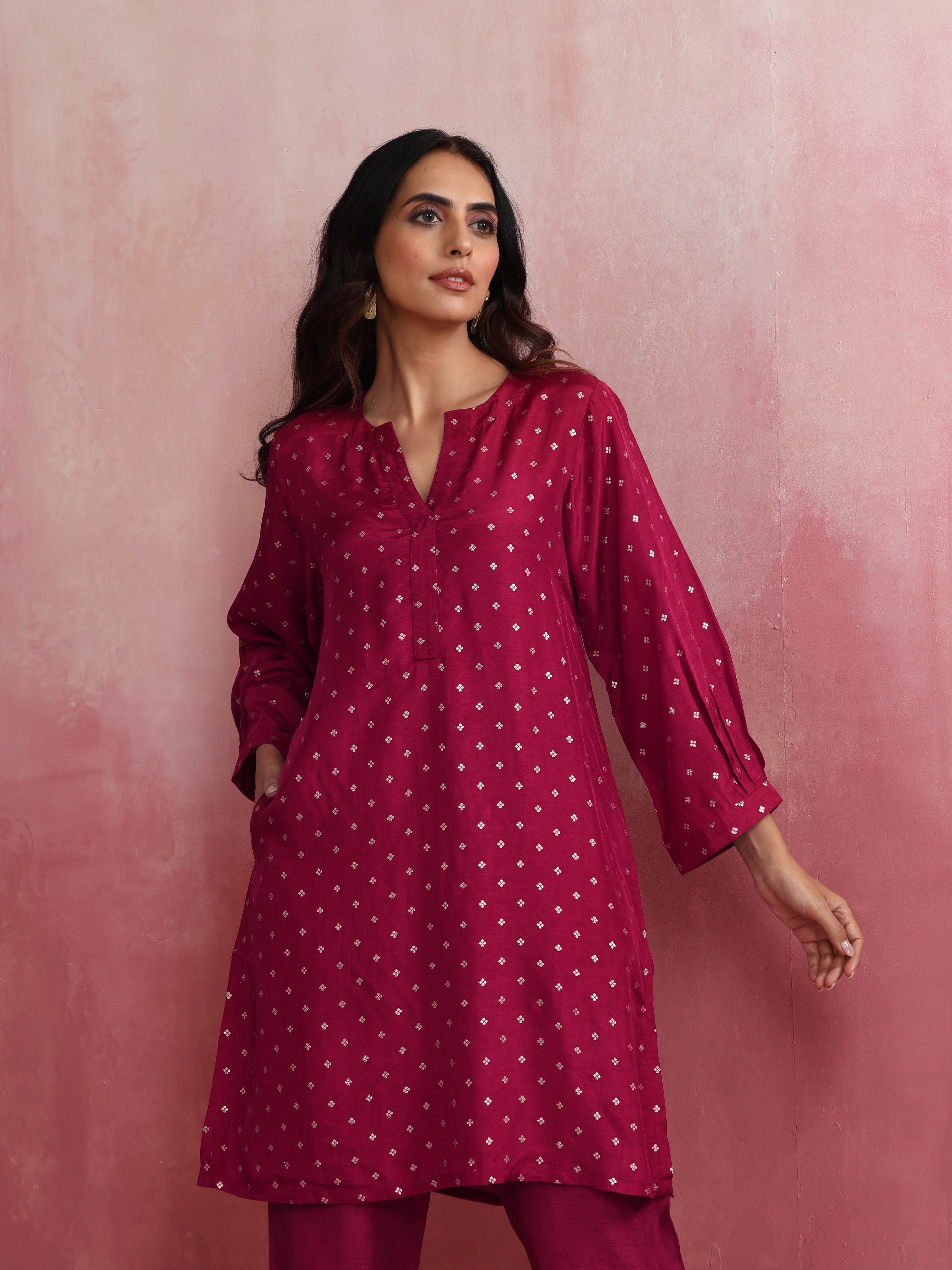 • Elevate your style with this pink viscose silk kurta with 3/4th sleeves.