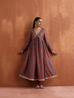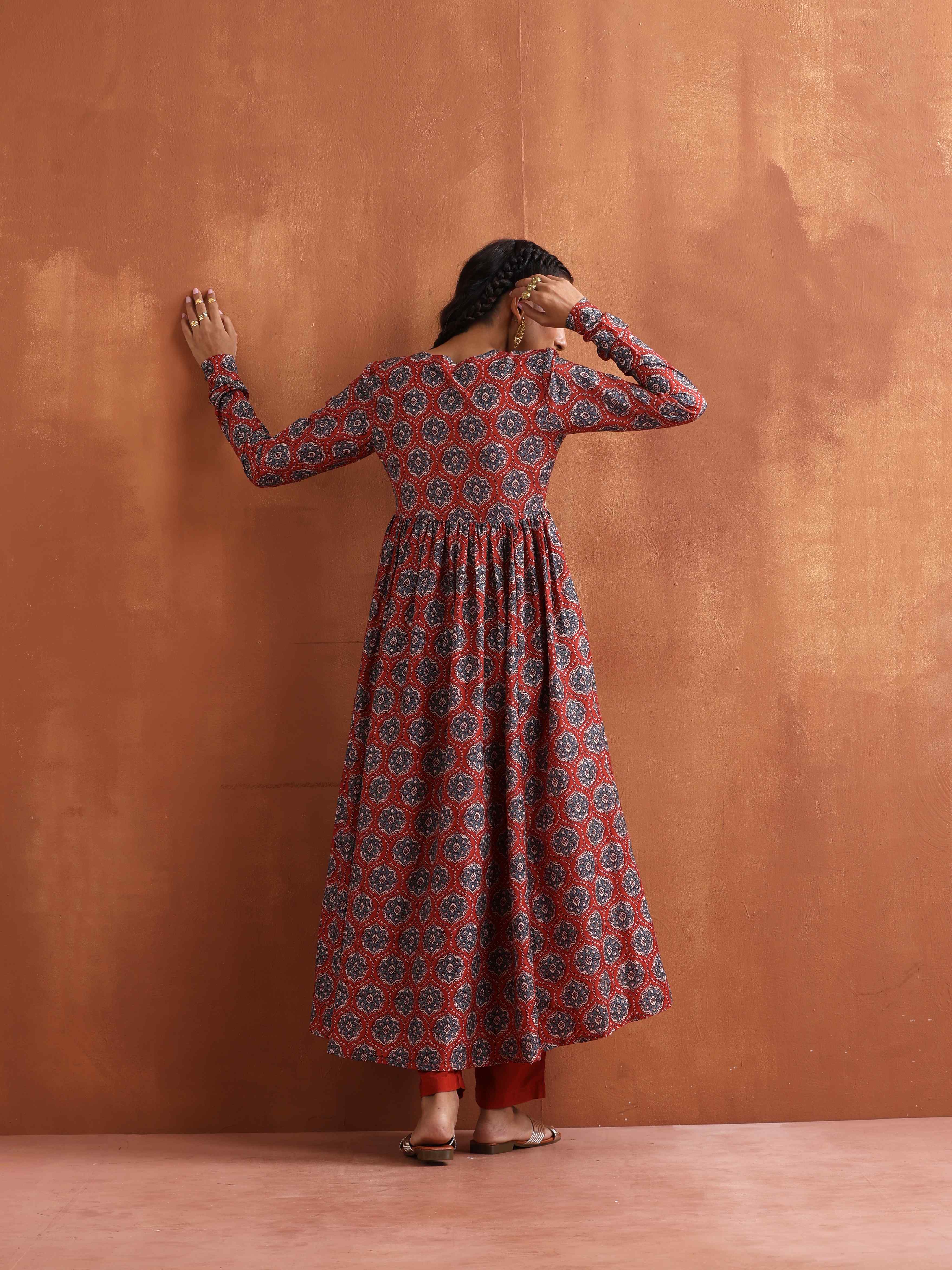 trueBrowns Rust Ajrak Print Flared Anarkali Kurta Set