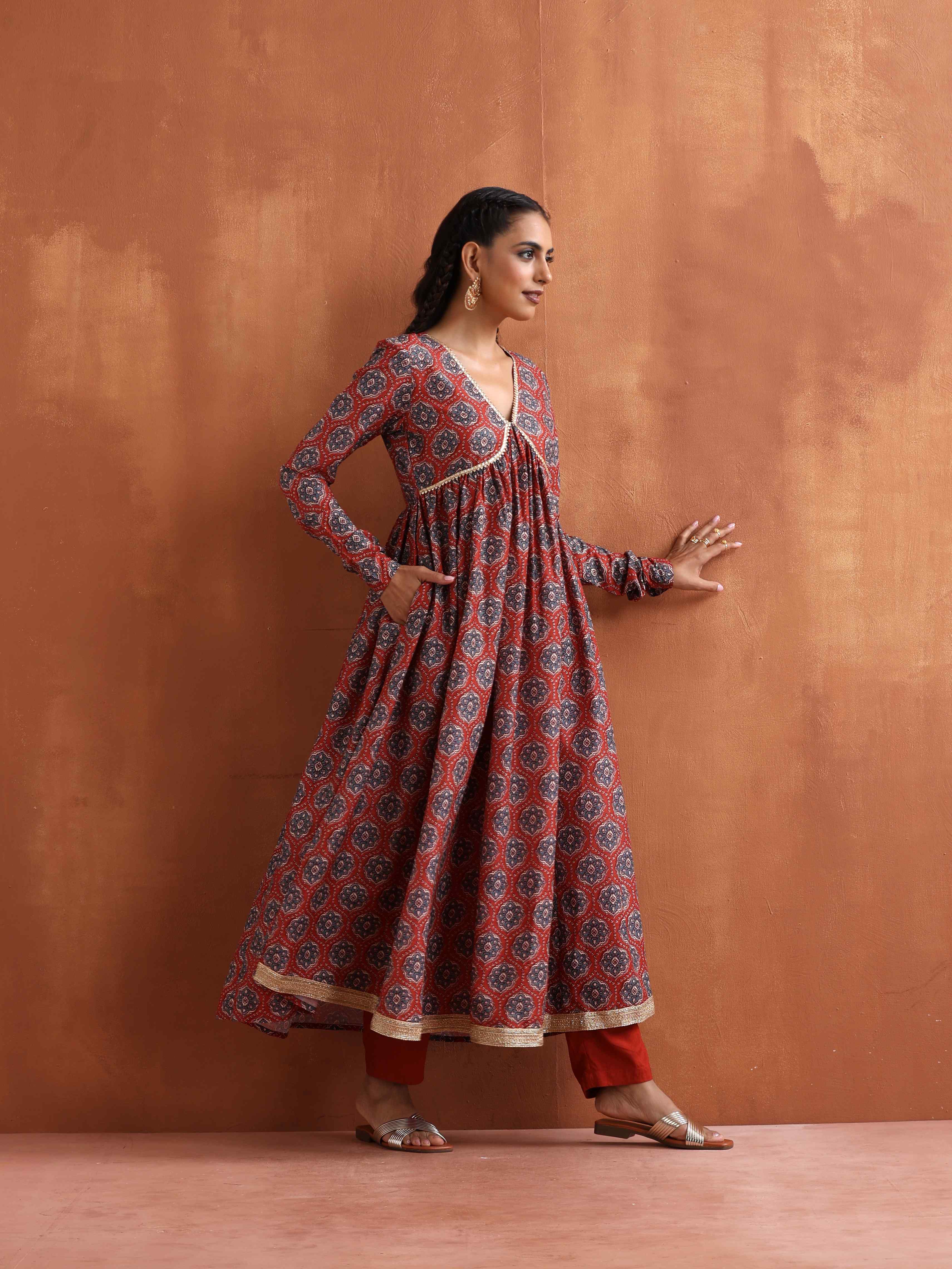 trueBrowns Rust Ajrak Print Flared Anarkali Kurta SetDescription Elevate your style with this rust ajrak print flared anarkali kurta paired with ru...