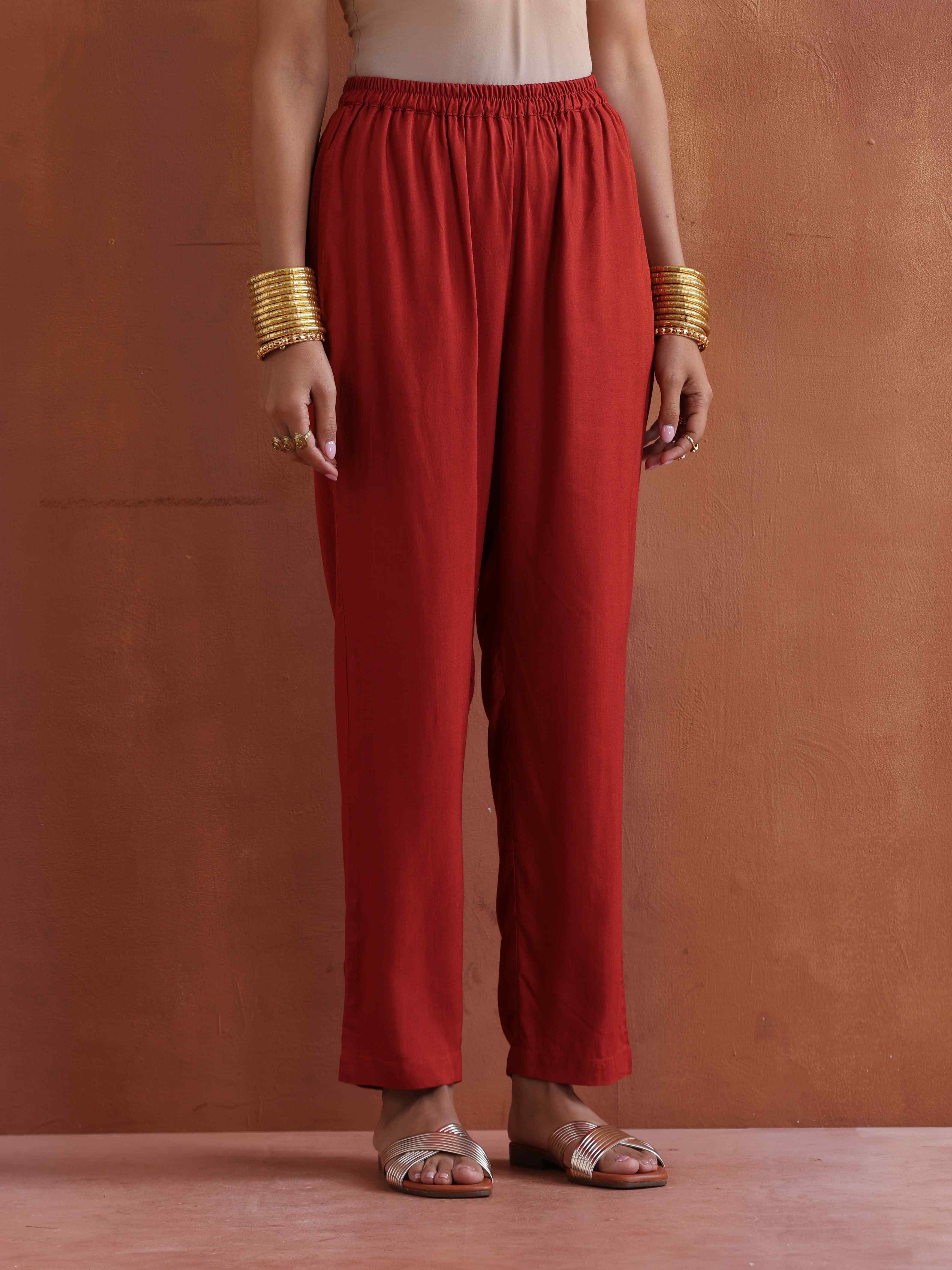 • Elevate your style with this rust ajrak print flared anarkali kurta paired with rust pant.