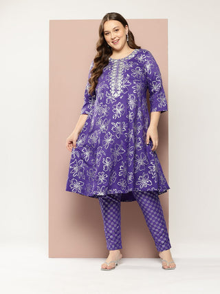 Sztori Plus Size Floral Printed Sequinned Pure Cotton A Line Kurta & Trousers With Dupatta