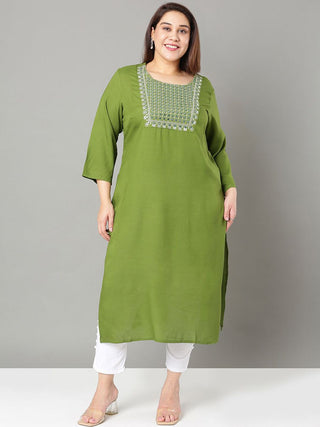 Sztori Plus Size Geometric Embroidered Thread Work Straight Kurta Product Details Colour: green and everglade Geometric embroidered Round neck Three-quarter, regular sleeves Straight shape with regular style Thread work detail Calf length with straight hem Machine weave regular viscose rayon Size & Fit The model (height 5'8) is wearing a size S Material & Care Viscose RayonMachine Wash Specifications Sleeve Length: Three-Quarter Sleeves Shape: Straight Neck: Round Neck Print or Pattern Type: Geometric Design Styling: Regular Slit Detail: Side Slits Ornamentation: Thread Work Length: Calf Length Hemline: Straight Colour Family: Earthy Weave Pattern: Regular Weave Type: Machine Weave Occasion: Daily Number of Items: 1 Package Contains: 1 kurta Legal Disclaimer: Product colour may slightly vary due to photographic lighting sources or your monitor settings.