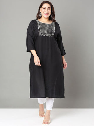 Sztori Plus Size Floral Yoke Design Sequinned Straight Kurta Product Details Colour: black & white Floral yoke design Round neck Three-quarter, regular sleeves Straight shape with regular style Sequinned detail Machine weave regular viscose rayon Size & Fit The model (height 5'8) is wearing a size XXL Material & Care Viscose RayonMachine Wash Specifications Sleeve Length: Three-Quarter Sleeves Shape: Straight Neck: Round Neck Print or Pattern Type: Floral Design Styling: Regular Slit Detail: Side Slits Ornamentation: Sequins Length: Calf Length Hemline: Straight Colour Family: Earthy Weave Pattern: Regular Weave Type: Machine Weave Occasion: Festive Number of Items: 1 Package Contains: 1 kurta Legal Disclaimer: Product colour may slightly vary due to photographic lighting sources or your monitor settings.