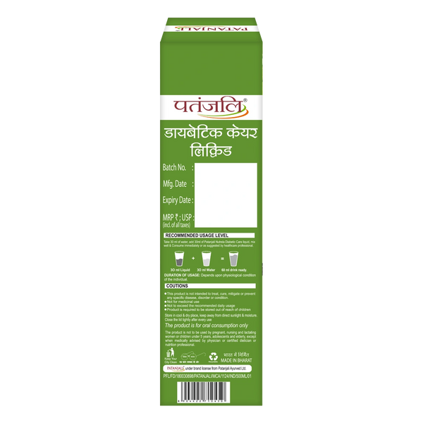 Take 30 ml of water, add 30ml of Patanjali Nutrela Diabetic Care liquid, mix well & Consume immediately or as suggested by healthcare professional.