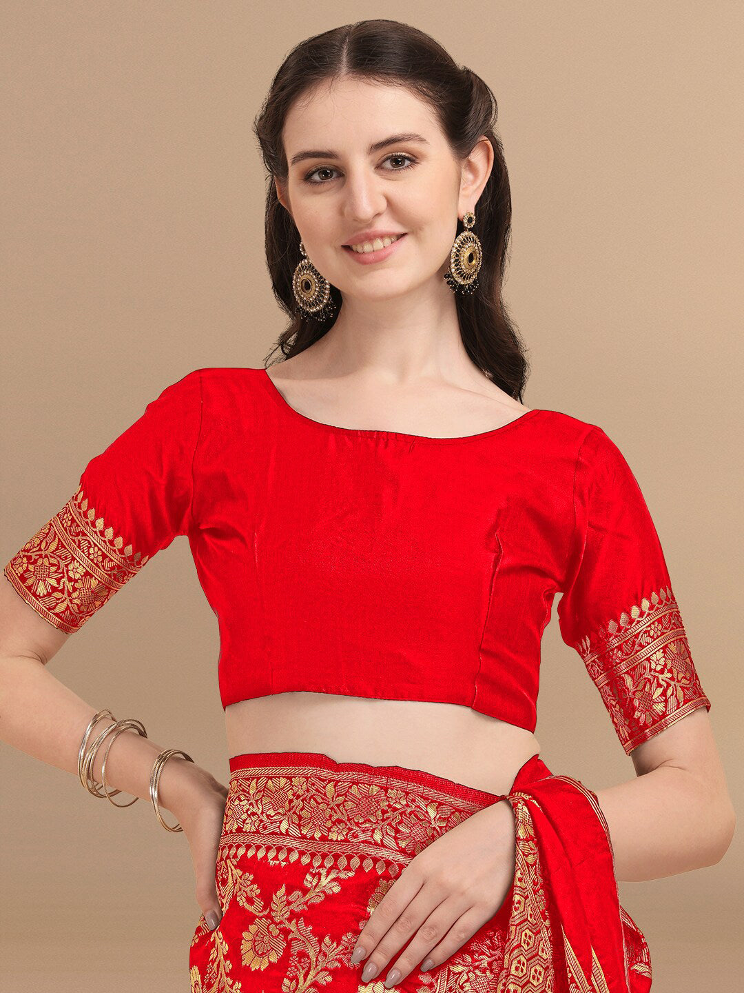 Kalini Red & Golden Floral Zari Silk Blend Banarasi Saree Product Details Design Details Red and golden banarasi saree Floral woven design...