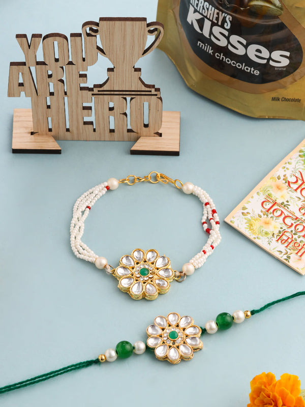 NVR Set of 2 Kundan Studded Floral Design Gold Toned Bhaiya Bhabhi Rakhi Combo