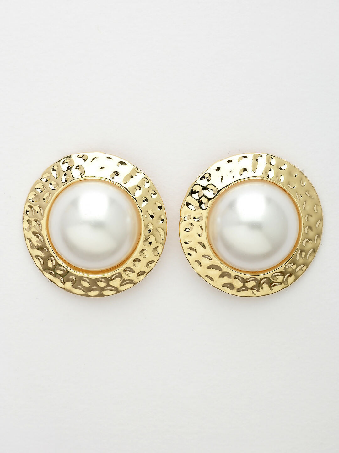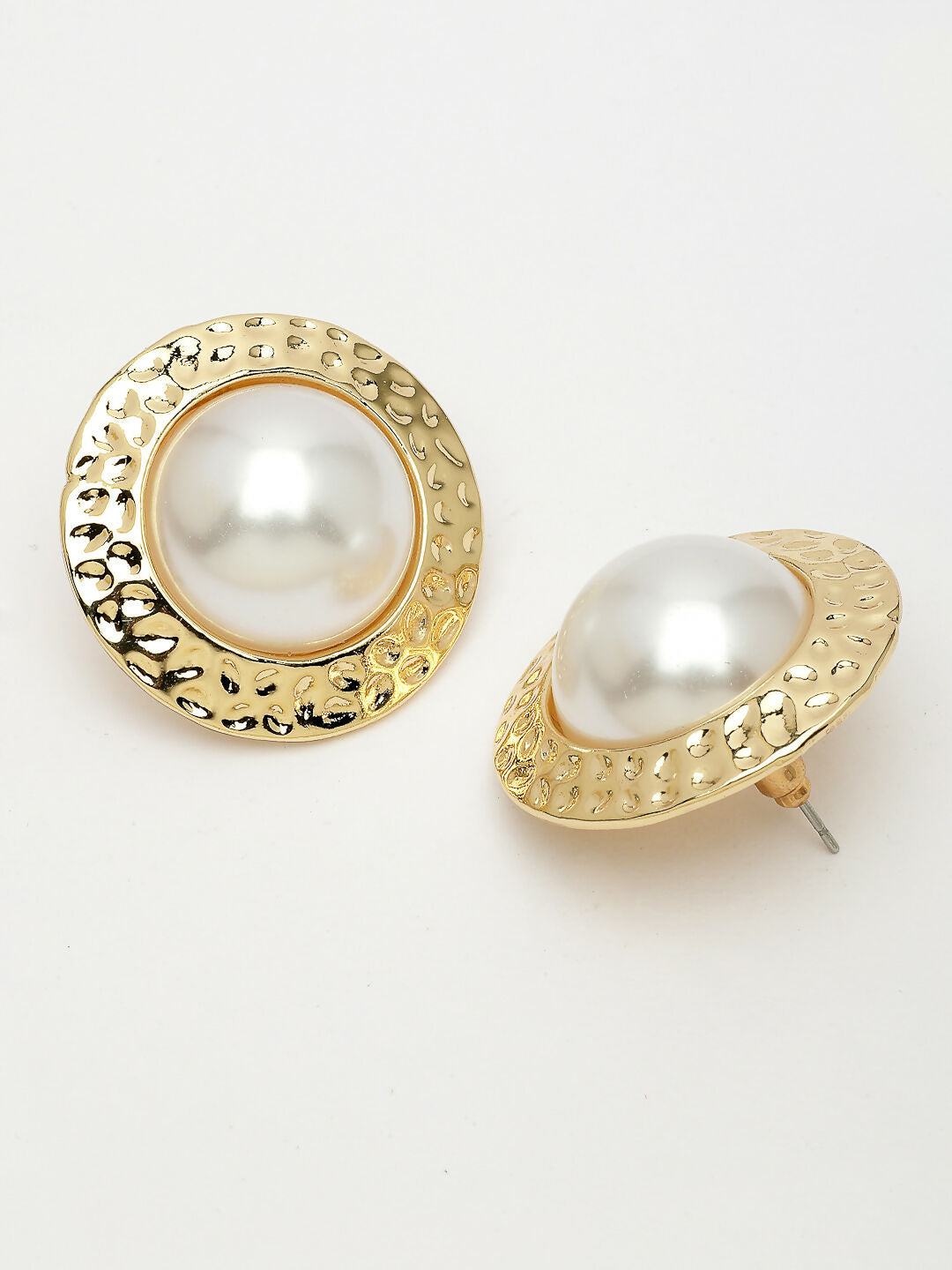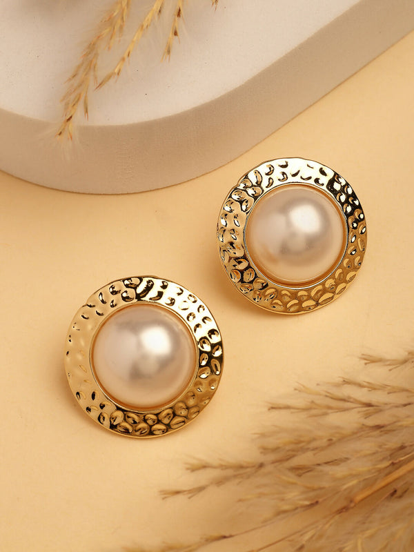 NVR Women's Gold-Polished White Pearl Circular Shape Studs Earring