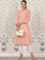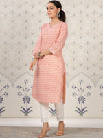 Ode by House of Pataudi Floral Printed Straight Pure Cotton Kurta Product Details Colour: Peach-coloured  Floral printed V-neck Three-quarter,...