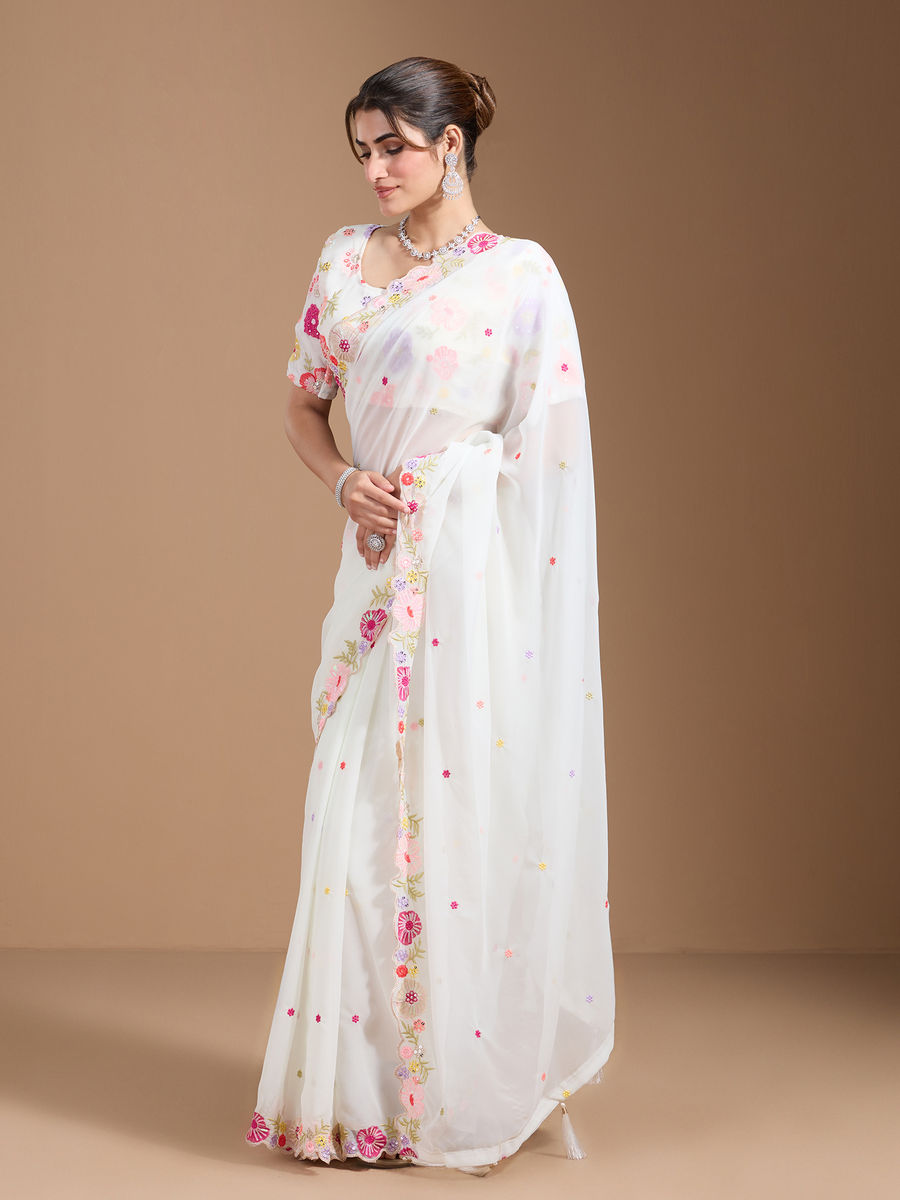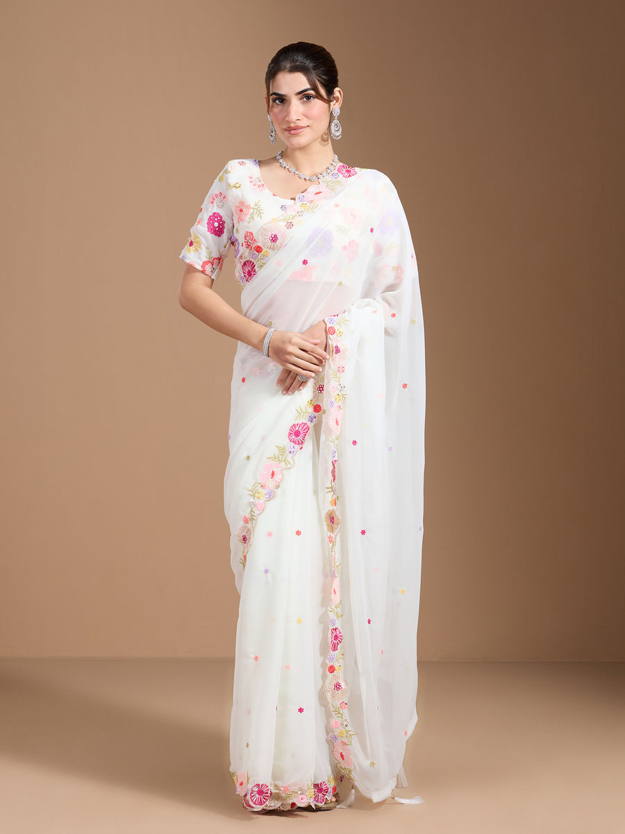 Vamika Embroidery Cream Georgette Bollywood Saree