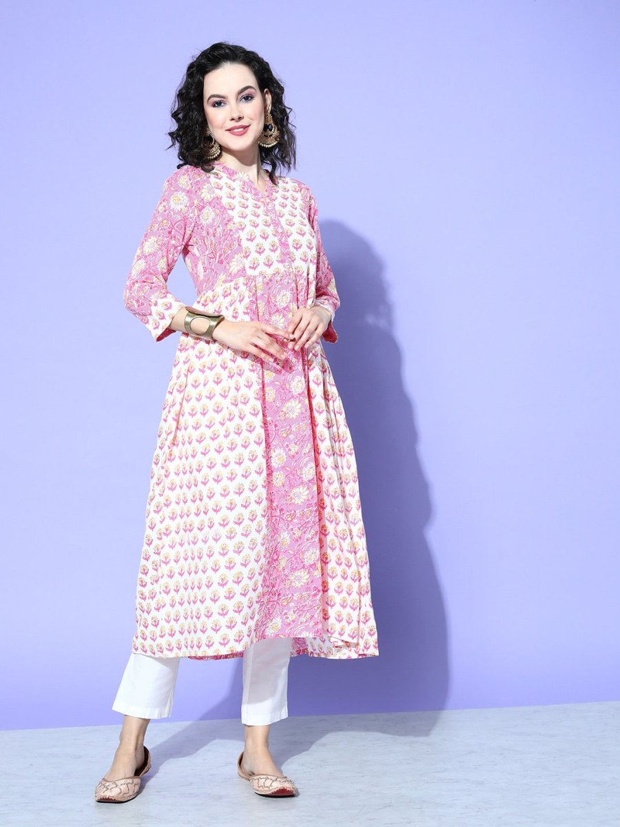 All About You Women Floral Printed Kurta Product Details Colour: pink Floral printed Mandarin collar Three-quarter, regular sleeves A-line shap...