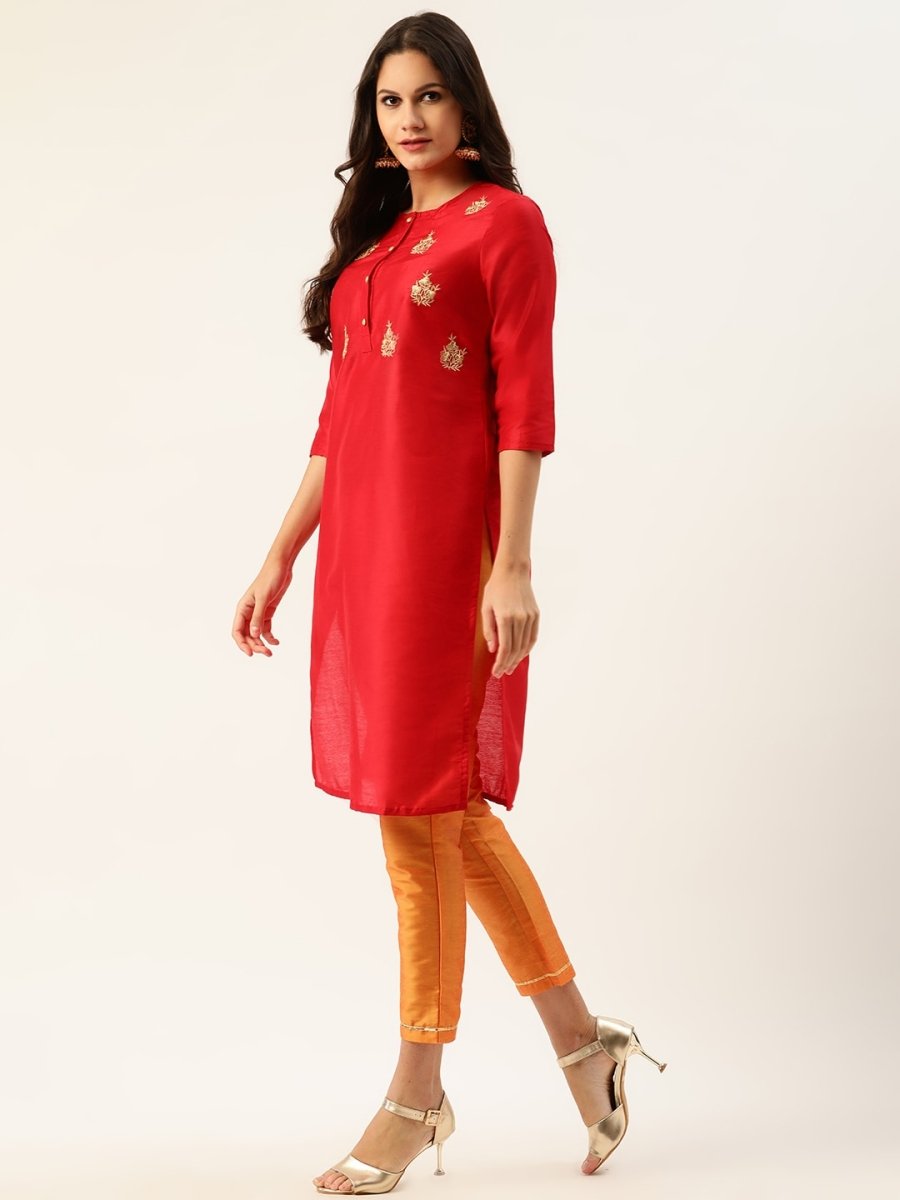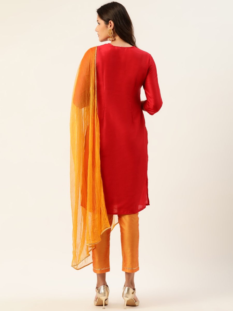 All About You Women Red & Orange Embroidered Yoke Design Kurta set with Dupatta Product Details Red yoke design Kurta with Trousers with dup...