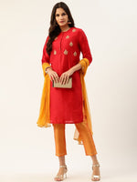 All About You Women Red & Orange Embroidered Yoke Design Kurta set with Dupatta