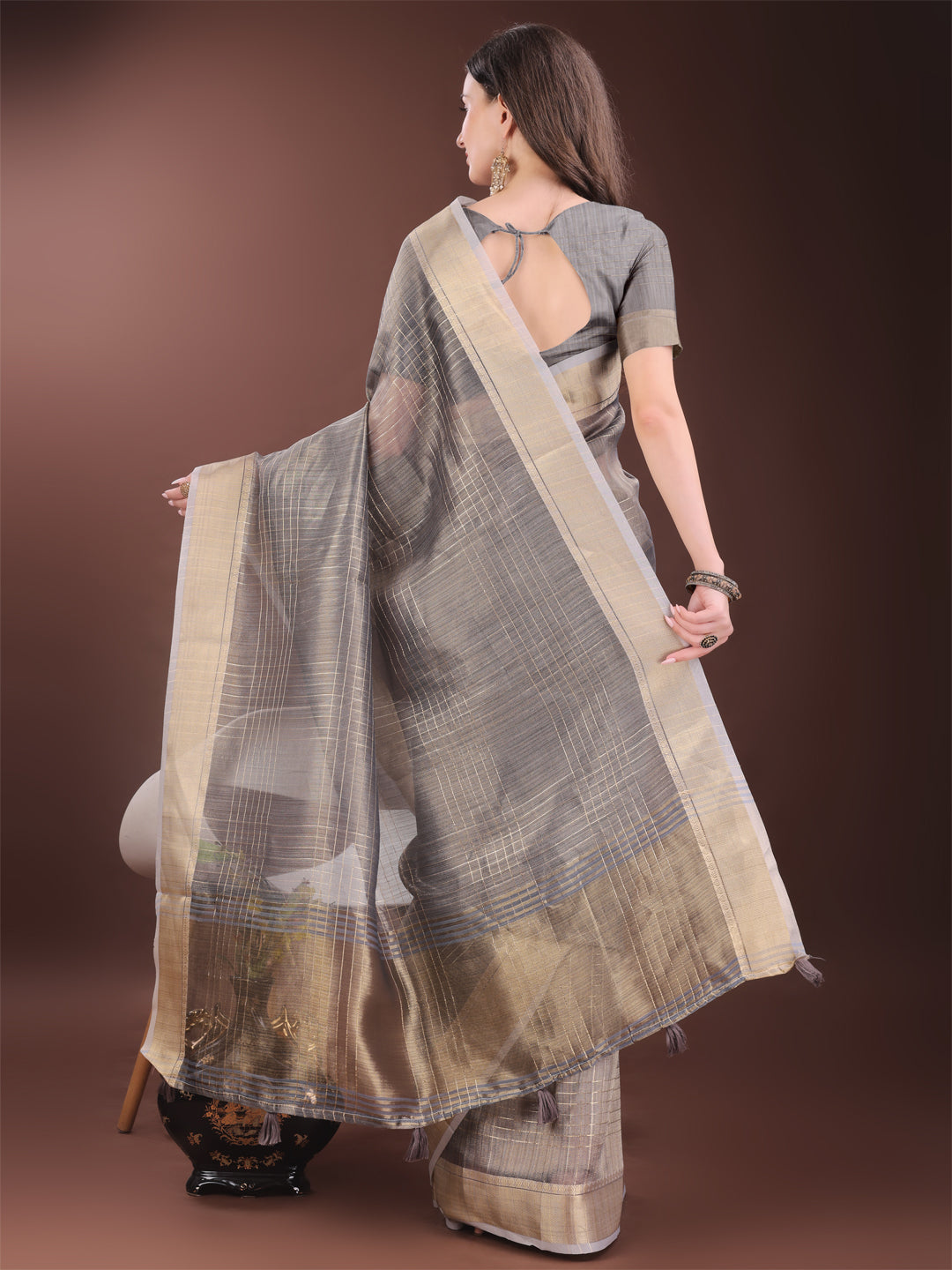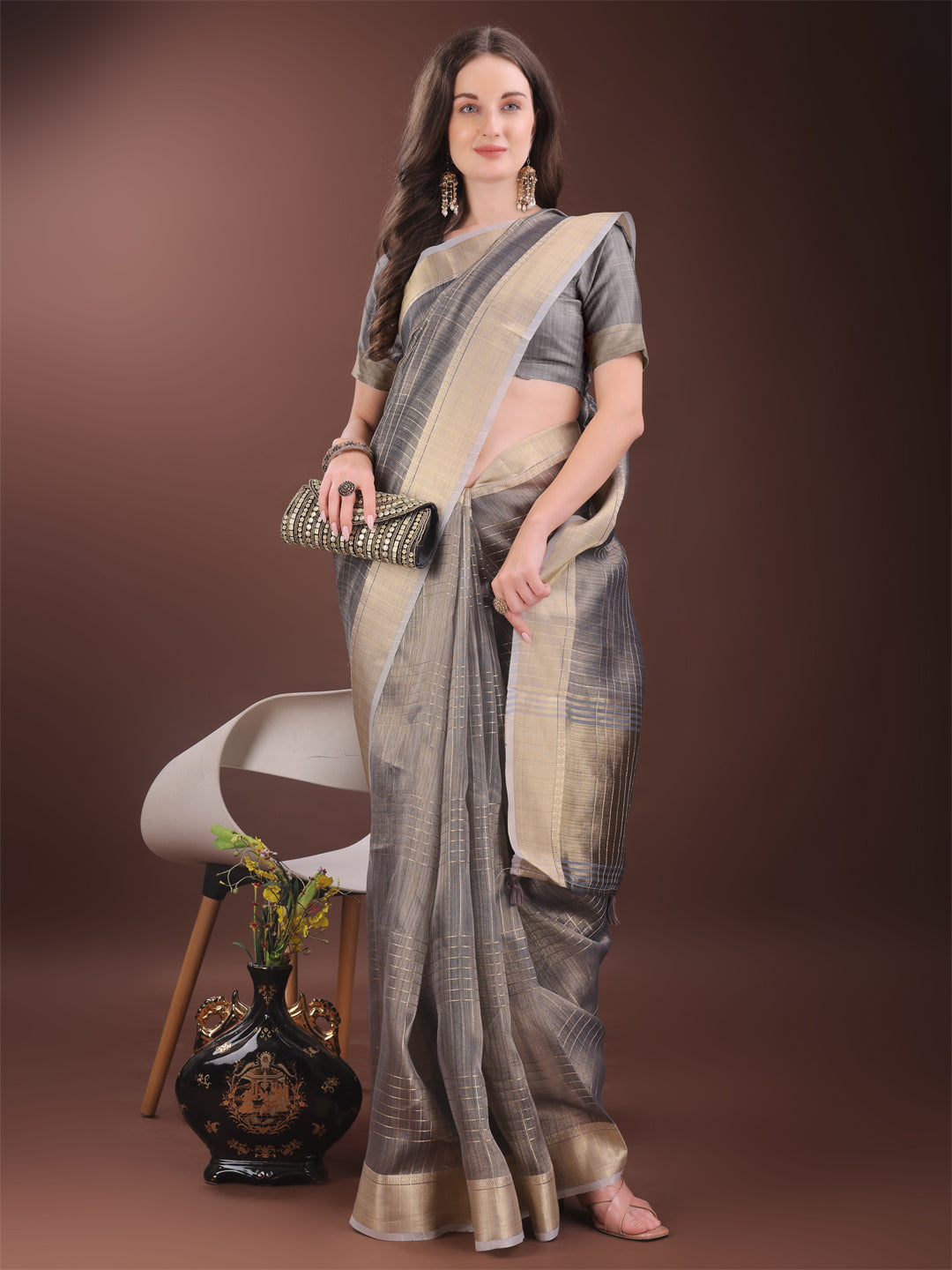 Crafted in lustrous Organza, this grey saree with a golden checked design is a timeless blend of tradition and sophistication. Perfect for modern women who appreciate minimal yet majestic style.