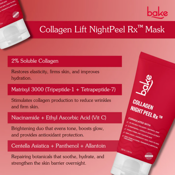 Experience visibly firmer, lifted, and more youthful-looking skin with BAKE Collagen Night Peel Rx — powered by 2% Soluble Collagen and Matrixyl 3000. This advanced overnight peel-off mask boosts elasticity, tightens sagging skin, and reduces the appearance of fine lines. Soluble Collagen deeply hydrates, restores bounce, and smooths stressed, tired skin. Matrixyl 3000 (Tripeptide-1 + Tetrapeptide-7) stimulates collagen synthesis and improves overall texture. Enriched with Niacinamide, the mask strengthens the skin barrier, reduces dullness, and enhances natural glow. Ethyl Ascorbic Acid (Vitamin C) brightens complexion and protects against oxidative damage.Panthenol (Pro-Vitamin B5) locks in moisture, intensely nourishes, and repairs sensitive skin overnight. The peel-off gel removes dead skin, impurities, and excess oil while tightening pores. Skin feels firmer, hydrated, and refreshed with a radiant, youthful finish the next morning. Ideal for reducing sagging, improving elasticity, and giving the face a sculpted, lifted look. Non-sticky, lightweight, safe for overnight use, and suitable for men & women of all skin types. Wake up to tighter, smoother, glowing skin with this all-in-one collagen repair mask.