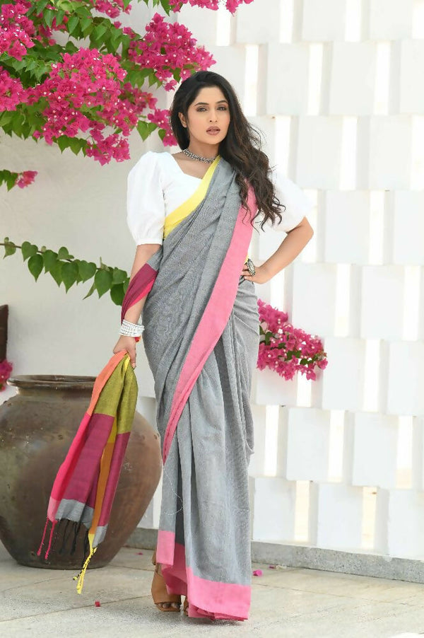 Beatitude Grey Cotton Handloom SareeAbout the Product: Color: Grey Material: Cotton Legal Disclaimer: Product color may slightly vary due to phot...