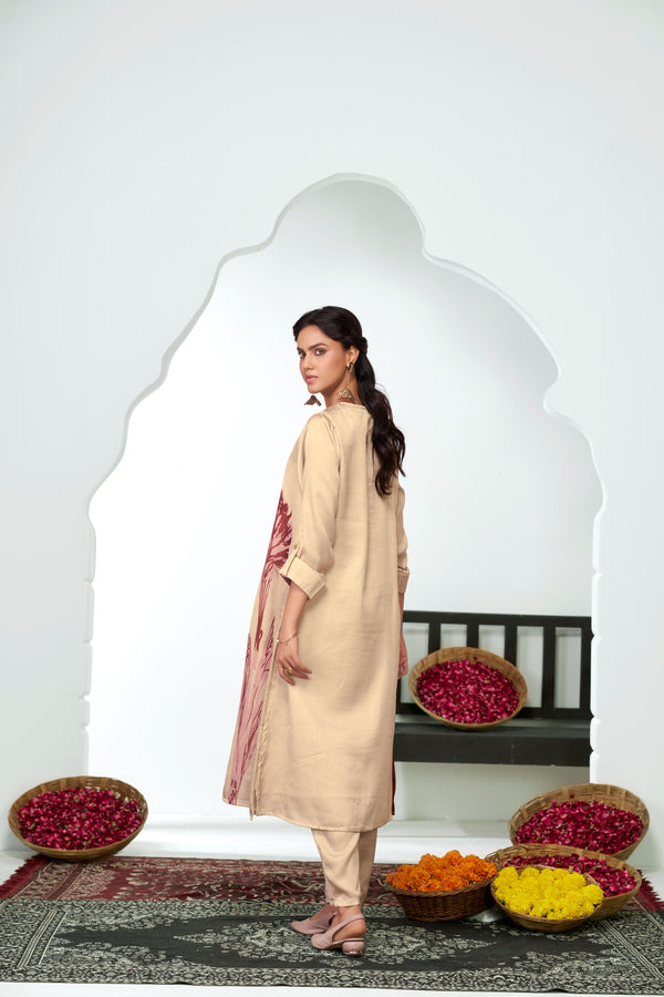 About the product:Tasneem Peach Kurta Set with Dupatta Elegant Prints and Soft LuxuryEmbrace soft elegance and timeless charm with the Tasneem Peach Kurta Set. Crafted from premium vanilla satin silk for the kurta and breathable rayon for the bottom and dupatta, this 3-piece set features a delicate peach hue that radiates warmth and grace. The beautifully coordinated prints across the kurta, bottom, and dupatta add a refined, artistic touch, offering a sophisticated yet comfortable look.