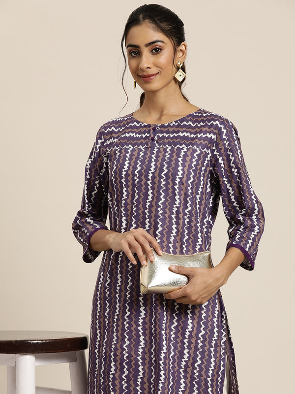 HERE&NOW Abstract Printed Pure Cotton Kurta Product Details Colour: purple and white Abstract printed Round neck Three-quarter, regular sle...