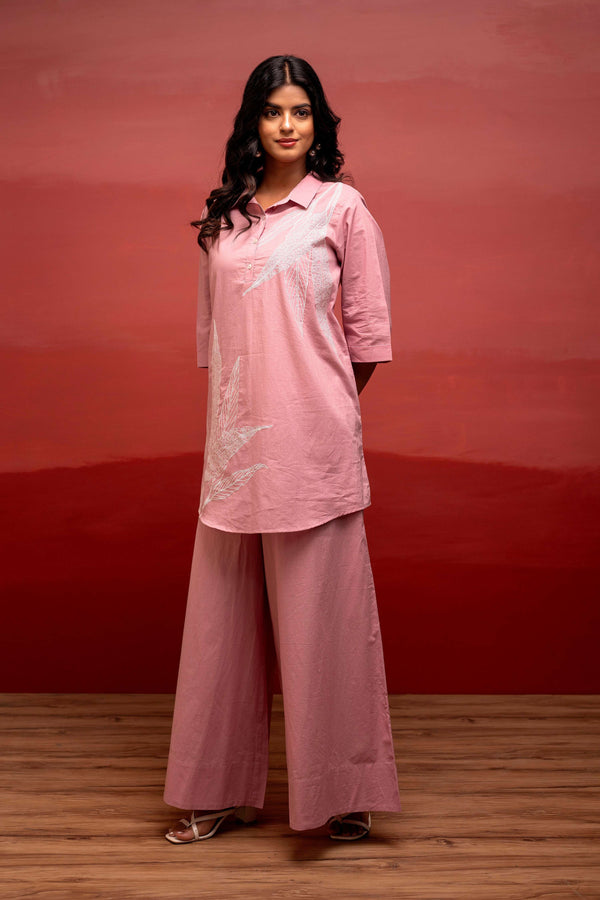 This festive onionpink cotton co-ord set features a straight shirt with curved hem, shirt collar, 3/4 regular sleeves, and button closure. It’s paired with solid cotton slip-on pants. The look is enhanced with intricate thread work and crafted for a regular fit.Legal Disclaimer :Product color may slightly vary due to photographic lighting sources or your monitor settings.