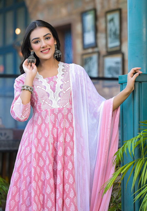 Juniper Powder Rose Pink Lace-Trim Printed Kurta Set With Dupatta