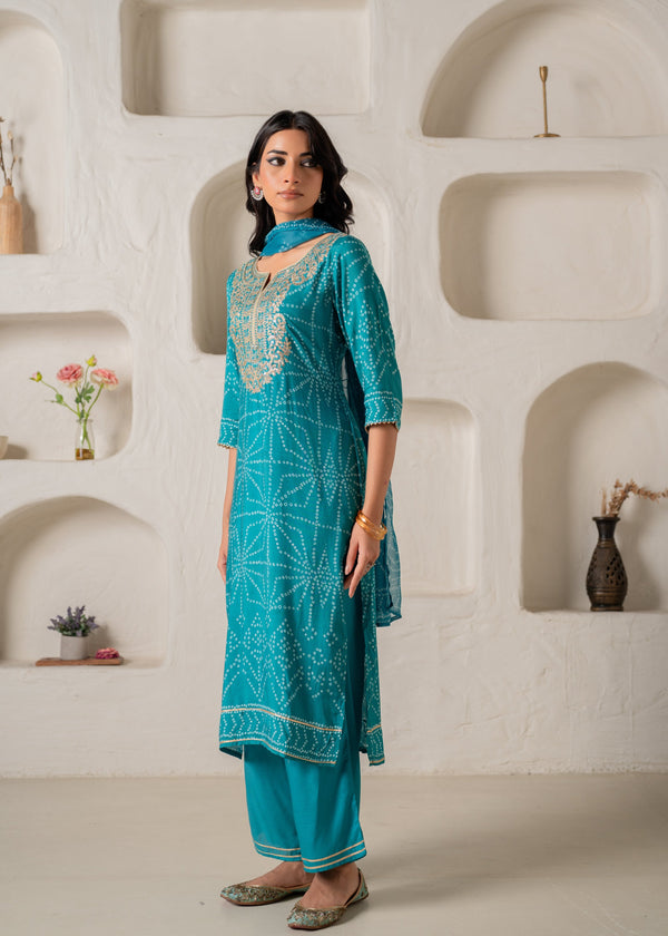 A refreshing turquoise three-piece suit featuring a bandhani-inspired printed kurta, coordinated straight pants, and a sheer dupatta. The neckline is richly adorned with thread embroidery, adding a handcrafted charm. Perfect for festive mornings, casual gatherings, or elegant daywear rooted in Indian craft tradition.