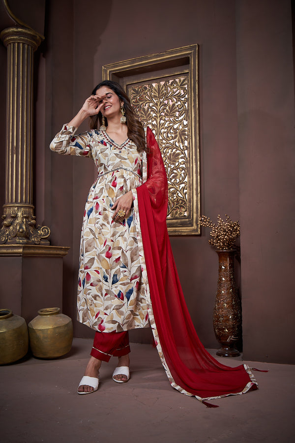 Jyoti Fashion Women's Maroon Rayon Floral Print with Handwork Designer Kurta Set with Dupatta