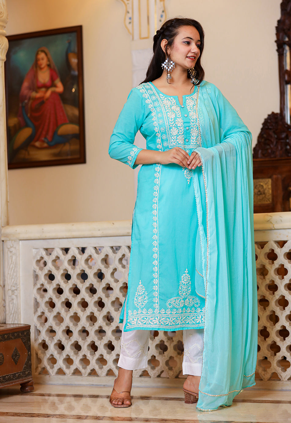 Kaajh Women's Turquoise Hand Embroidered Lucknow Chikankari Kurta Set With Dupatta
