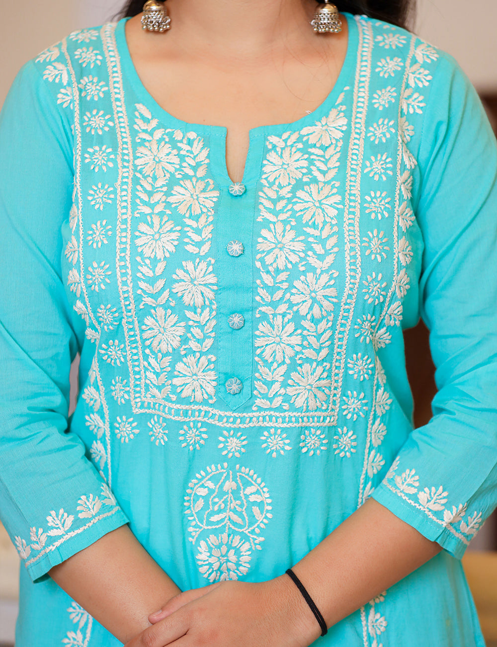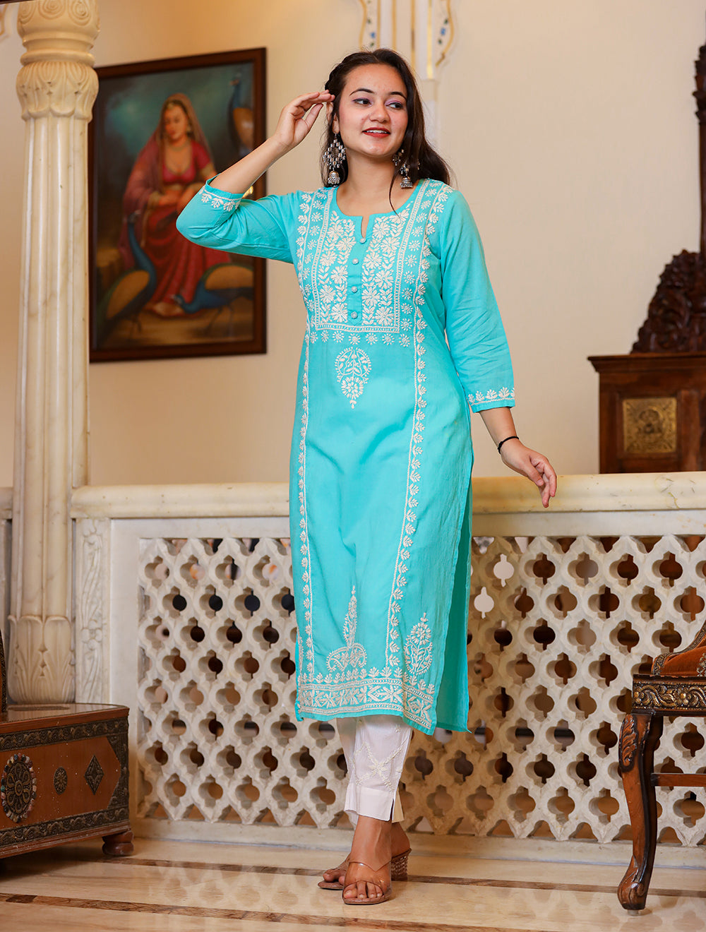 Kaajh Women's Turquoise Hand Embroidered Lucknow Chikankari Kurta Set With DupattaLook elegant and classy this summer with the exclusive collection...