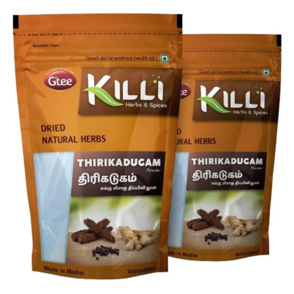 Killi Thirikadugam - Trikatu Churna - Thirukaduga PowderIngredients:Dried Ginger, Black Pepper, Long PepperHow to Use:Boil half a teaspoon (2-3g) o...