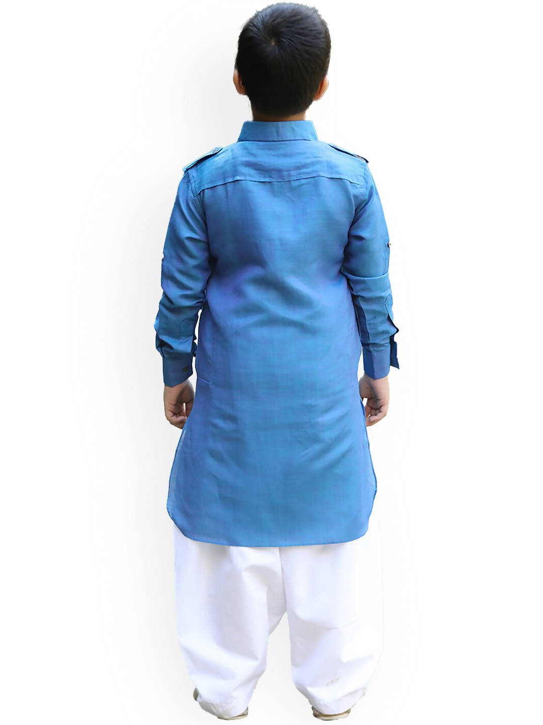 Manyavar Boys Blue Solid Cotton Blend Kurta Set Product Details Blue solid Kurta with patialaKurta design: Solid Pathani shape Regular style S...