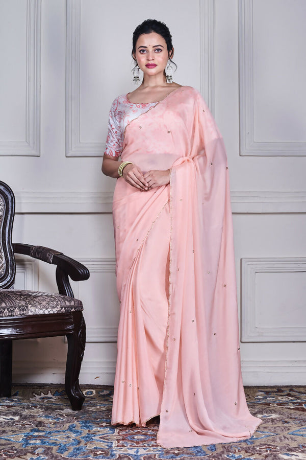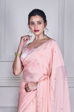 Morchari Peach Chiffon Hand Embroidery Saree And Stitched Blouse