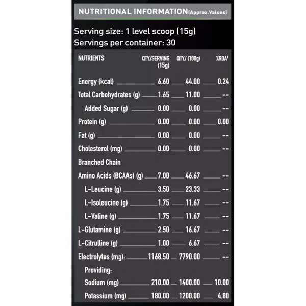 Branched Chain Amino Acids Powder L-Leucine, L-Isoleucine & L-Valine), L-Glutamine, Orange Fruit Powder, L-Citrulline DL-Malate 2:1), Trisodium Citrate Anhydrous, Natural Flavouring Substance, Acidity Regulator (INS 330), Potassium Chloride, Nature Identical Flavouring Substance, Natural Food Colours [INS 162 and INS 150d), Sodium Chloride & Sweetener (INS 955).