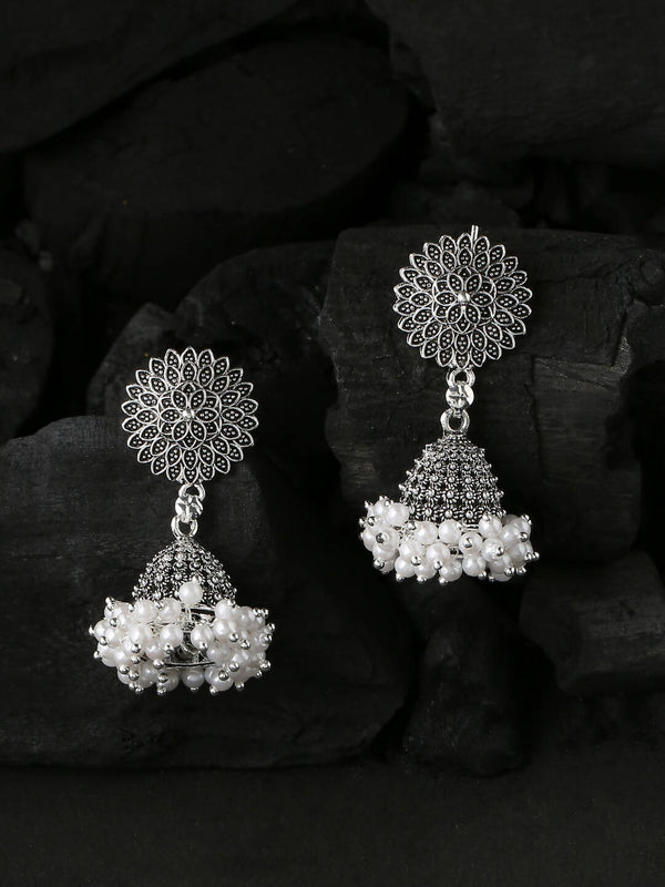 NVR Women Silver Toned Dome Shaped Jhumkas Earrings